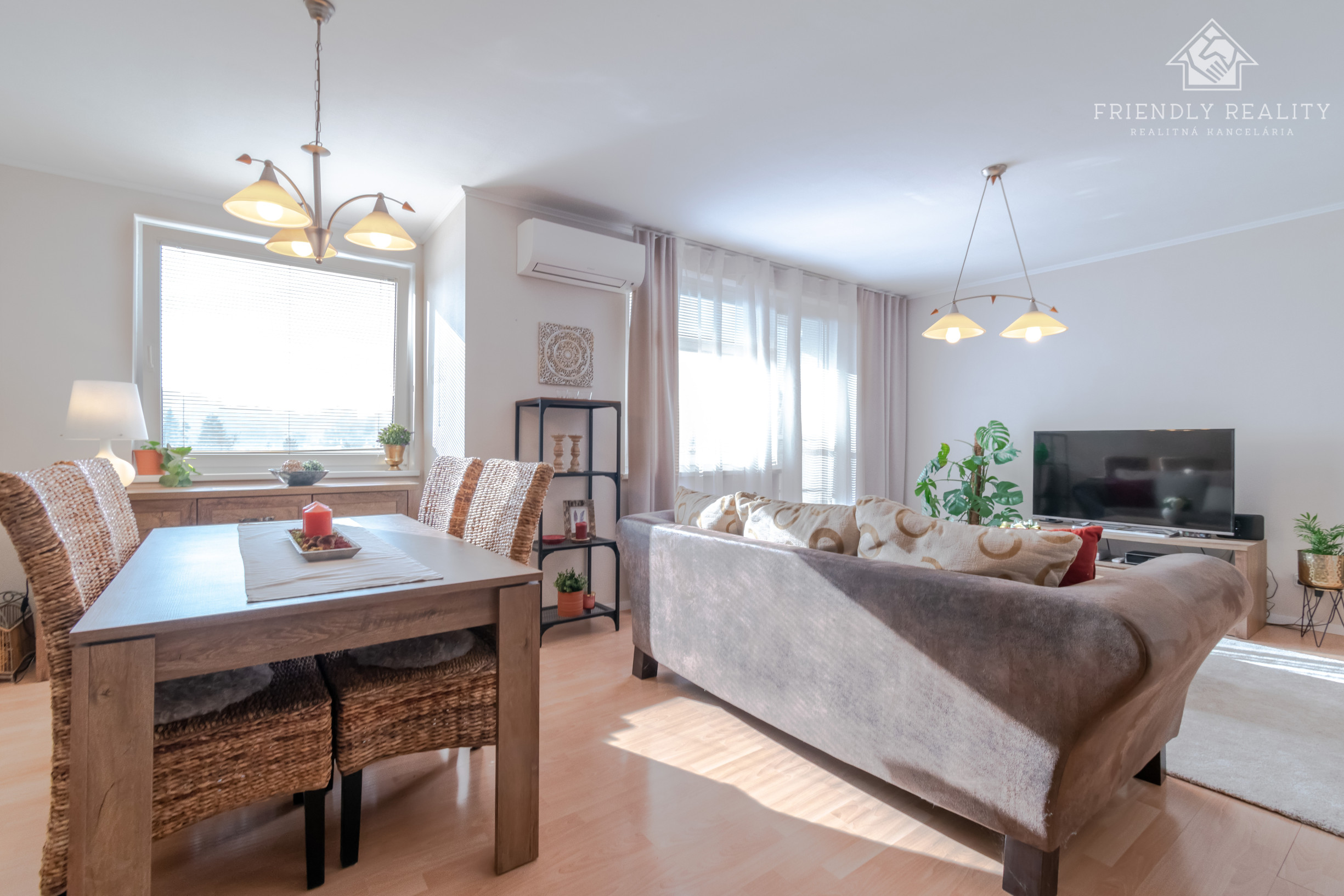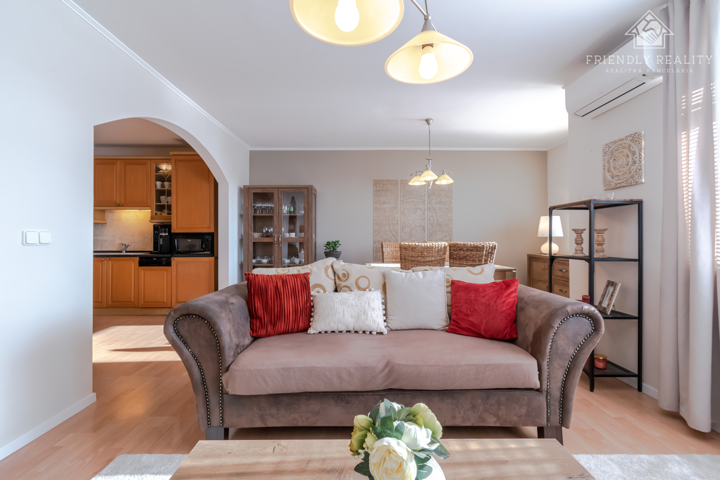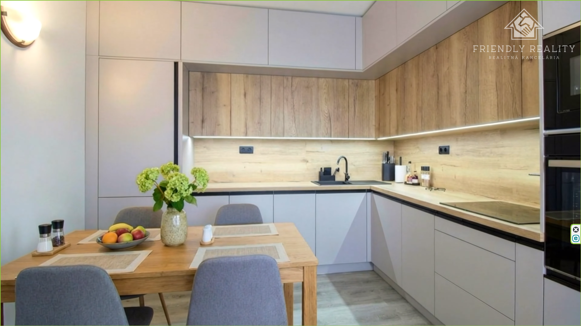 Denná časť bytu – obývacia izba prepojená s kuchyňou(39m2) je orientovaná na juhozápad a zaplavená prirodzeným svetlom počas celého popoludnia. Je vybavená kuchynskou linkou, vstavanými spotrebičmi ako sklokeramická varná doska, rúra, umývačka riadu a chladnička. V letných mesiacoch komfort dopĺňa klimatizácia v obývacej izbe, vďaka ktorej je interiér príjemný aj počas horúcich dní.